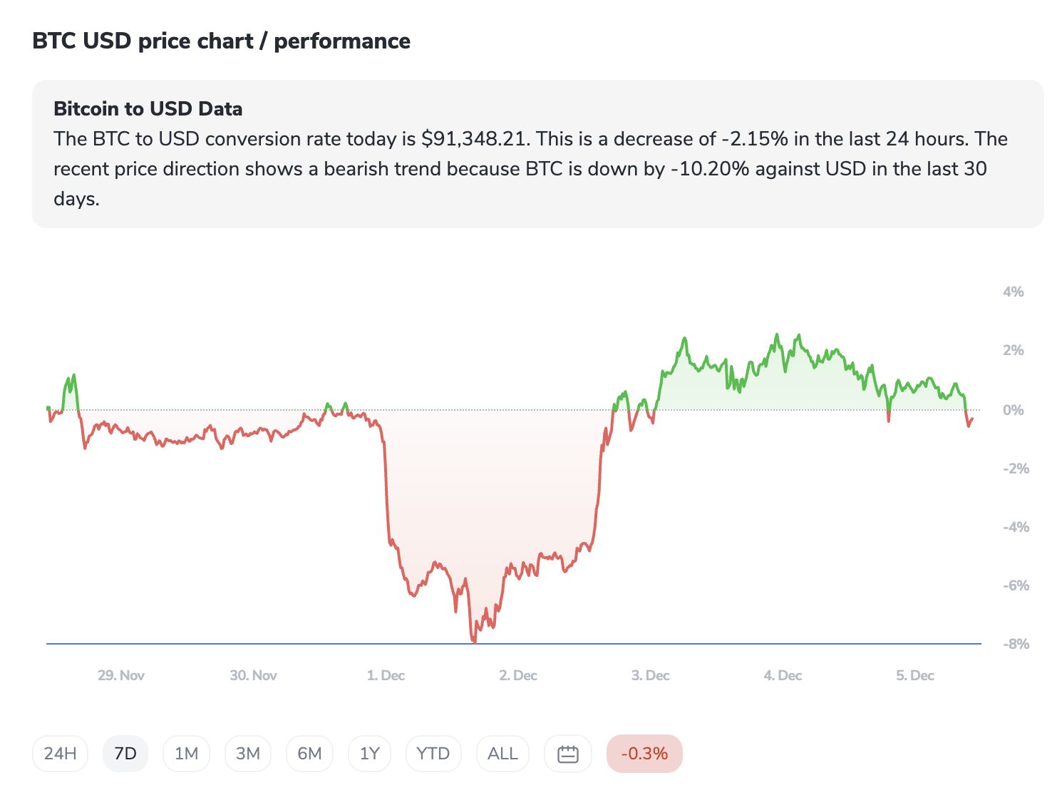 Trading at $91,108, BTC is down about 2.5% over 24 hours but effectively flat for the week. The chart shows resistance near $93.8k. The volume is respectable at $44B, indicating that this dip is being bought, albeit cautiously.