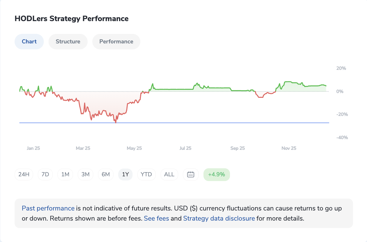 HODLers also stood out in 2025, delivering a positive yearly return through a stability-first approach built around a high USDC allocation paired with selective Bitcoin exposure. This positioning allowed the strategy to participate in market upside while maintaining lower overall volatility.