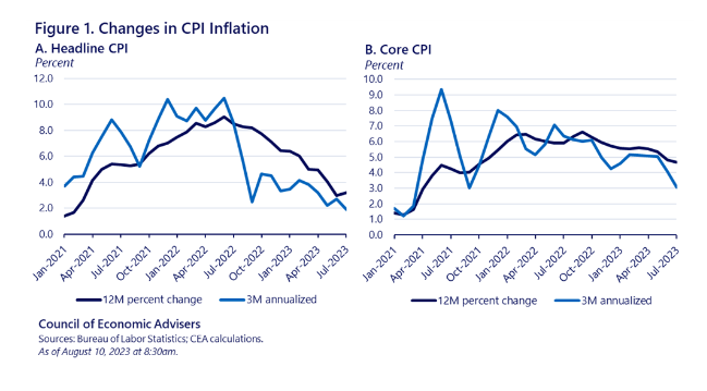 In the economic sphere, U.S. consumer prices experienced a 0.2% increase in July. The year-on-year increase of 3.2% in the Consumer Price Index (CPI) and 4.7% in Core CPI (excluding food and energy) could influence the Federal Reserve's decisions on interest rates, with potential implications for the broader financial market. The following charts shows headline and core inflation, presenting data for both 12-month and 3-month annualised growth rates.
