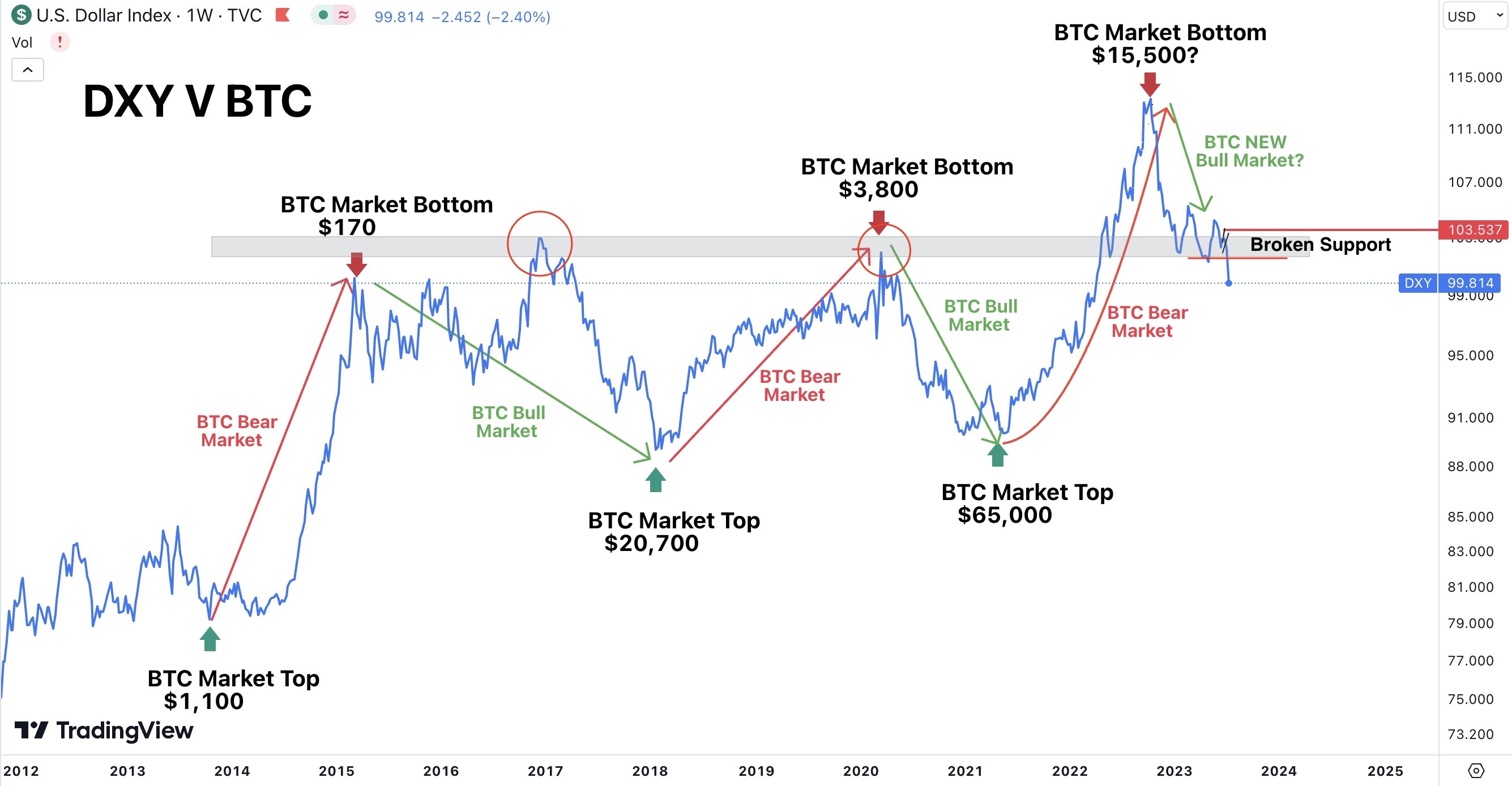 Due to lower-than-expected CPI statistics on Wednesday, the US Dollar Index (DXY) fell below the critical 101 support level. Inflation in the United States has continued to fall, and analysts now expect the FED to reach the peak of its rate-hiking cycle before the end of the year. Liquidity is leaving the global safe-haven currency and returning to risk assets. On the back of falling inflation figures, equities and cryptos have risen to the upside. The S&P500 is now only 6% away from its all-time high of 4814 back in January 2022.