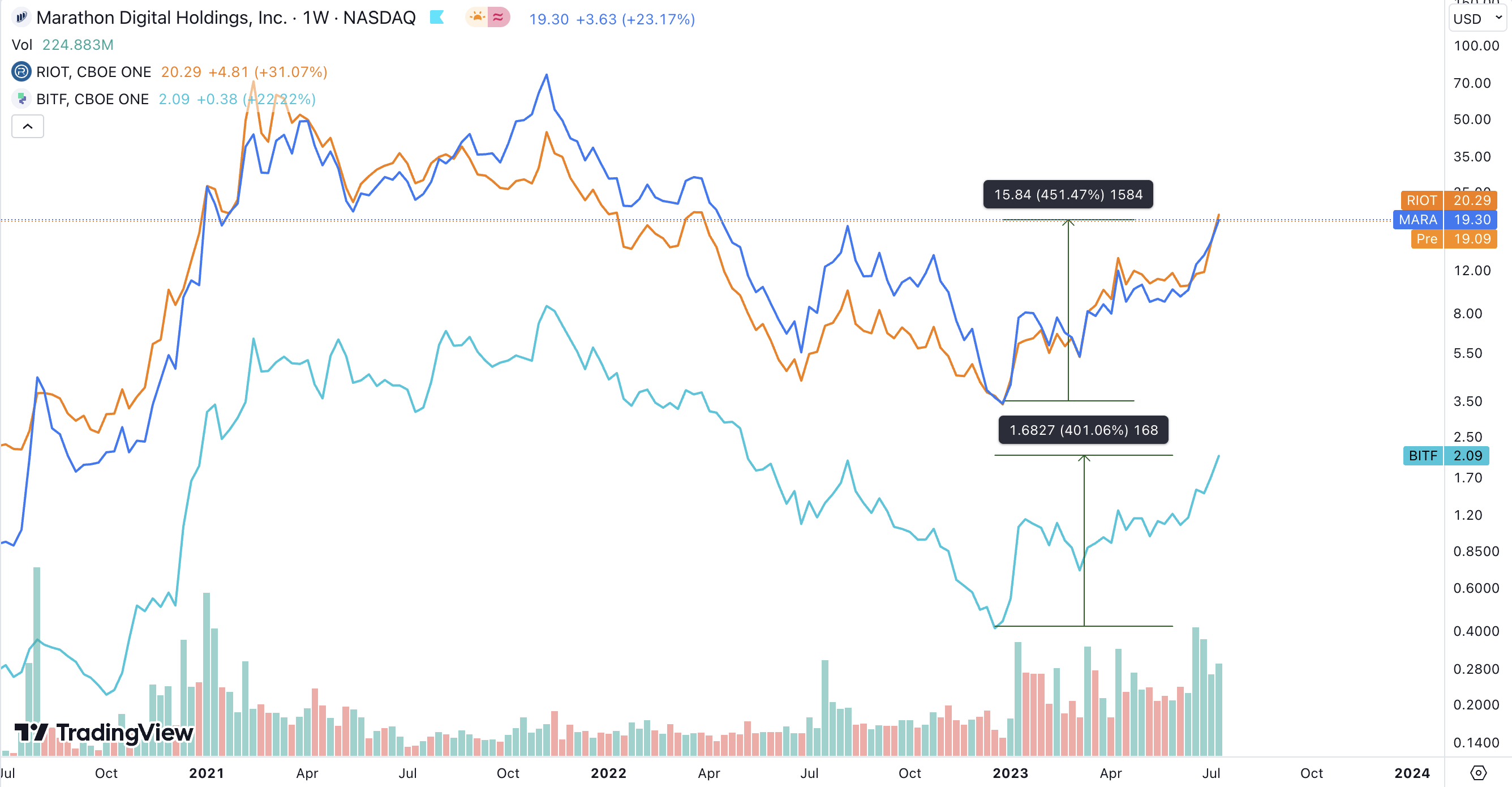 Volume in bitcoin-related equities has increased dramatically, with RIOT, MARA, and BITF all up more than 400% year to date. Bitcoin hit a new yearly high of 31850, indicating that investors are betting on the Bitcoin market through BTC-related stocks. Bitcoin mining companies benefited from this year's significant surge in the price of BTC, as well as lower energy prices. With a Bitcoin Spot ETF application expected to be approved in the US shortly, BTC-related equities are rising due to the possible supply shock that will hit the market.