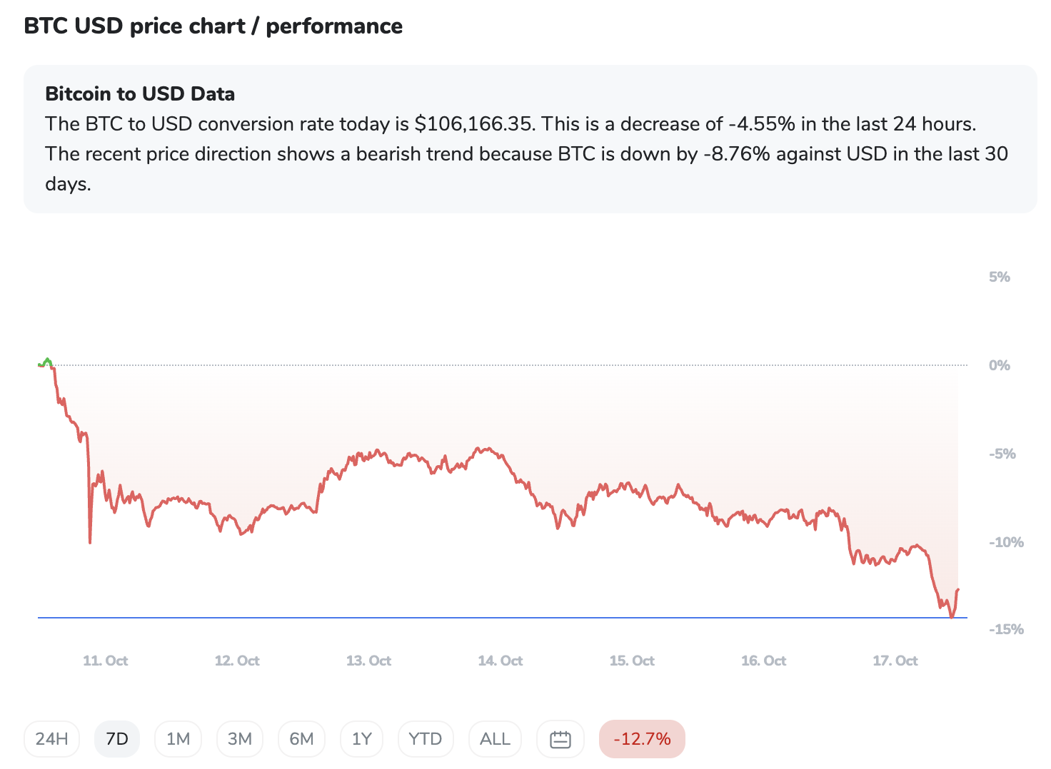 In the immediate aftermath of the macro tremors, the crypto market responded with a rather emphatic "ouch." Bitcoin (BTC), after flirting with new record highs earlier in October, found itself tumbling by 5.43% in the last 24 hours to around $105,416.