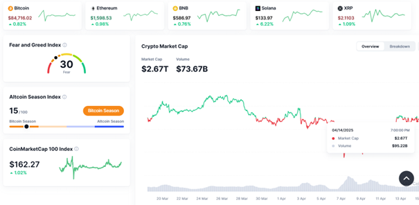 Meanwhile, the Fear and Greed Index shows a score of 30—indicating ongoing fear in the market. The Altcoin Season Index remains low at 15/100, suggesting Bitcoin dominance still persists. Still, with a total crypto market cap at $2.67 trillion and volume at $73.67 billion, there's cautious optimism building across the space.