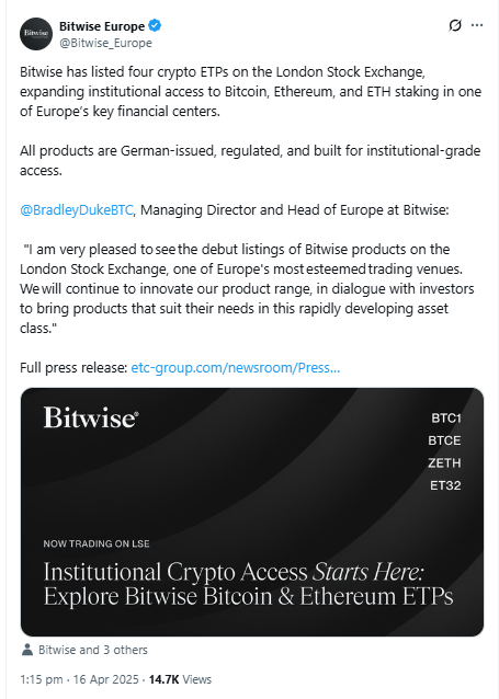Bitwise has made a bold move to attract institutional capital by listing four new crypto exchange-traded products (ETPs) on the London Stock Exchange. These include physically backed Bitcoin and Ethereum ETPs, one of which also distributes staking rewards. Designed for professional investors, the products align with institutional compliance standards by using regulated custody and trustee frameworks.
