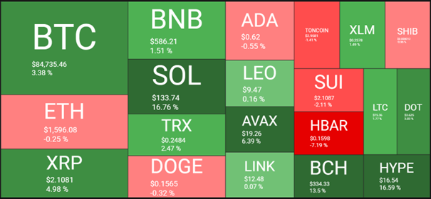 Bitcoin has held firm above $83,000 and currently trades at $84,735, posting a 3.38% weekly gain. Ethereum, on the other hand, remains range-bound near $1,596, with a slight -0.25% dip. Solana leads the rebound among major altcoins, surging 16.76% to $133.74, followed by notable gains in Bitcoin Cash (+13.5%), Avalanche (+6.39%), and XRP (+4.98%).