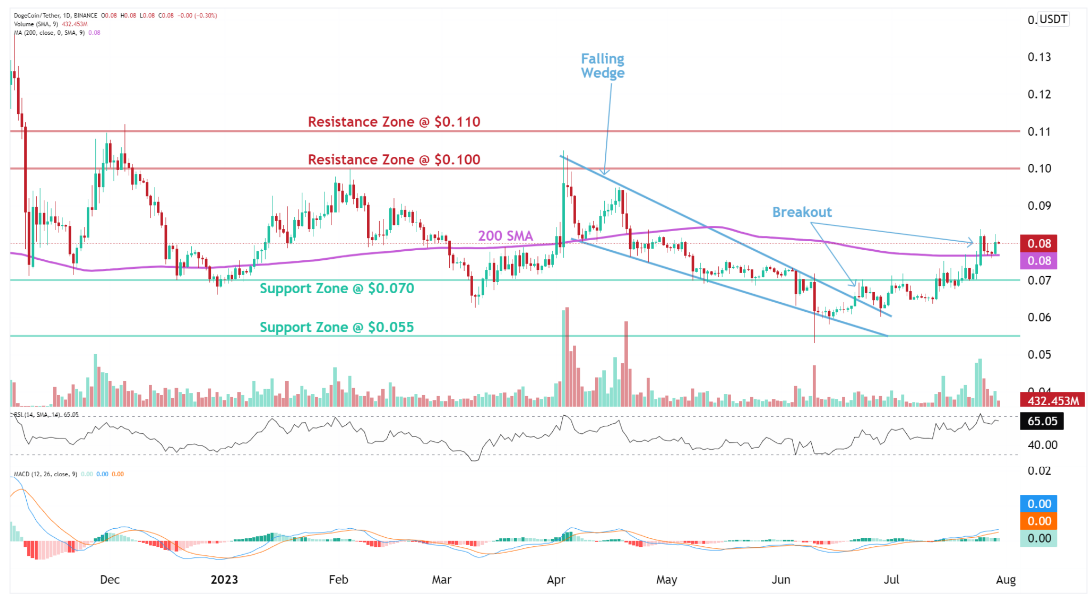 To recap, the technical analysis of Dogecoin (DOGE) suggests a bullish outlook in the short- and medium-term timeframes, supported by the breakout from the Falling Wedge pattern and the breach of key resistance levels.