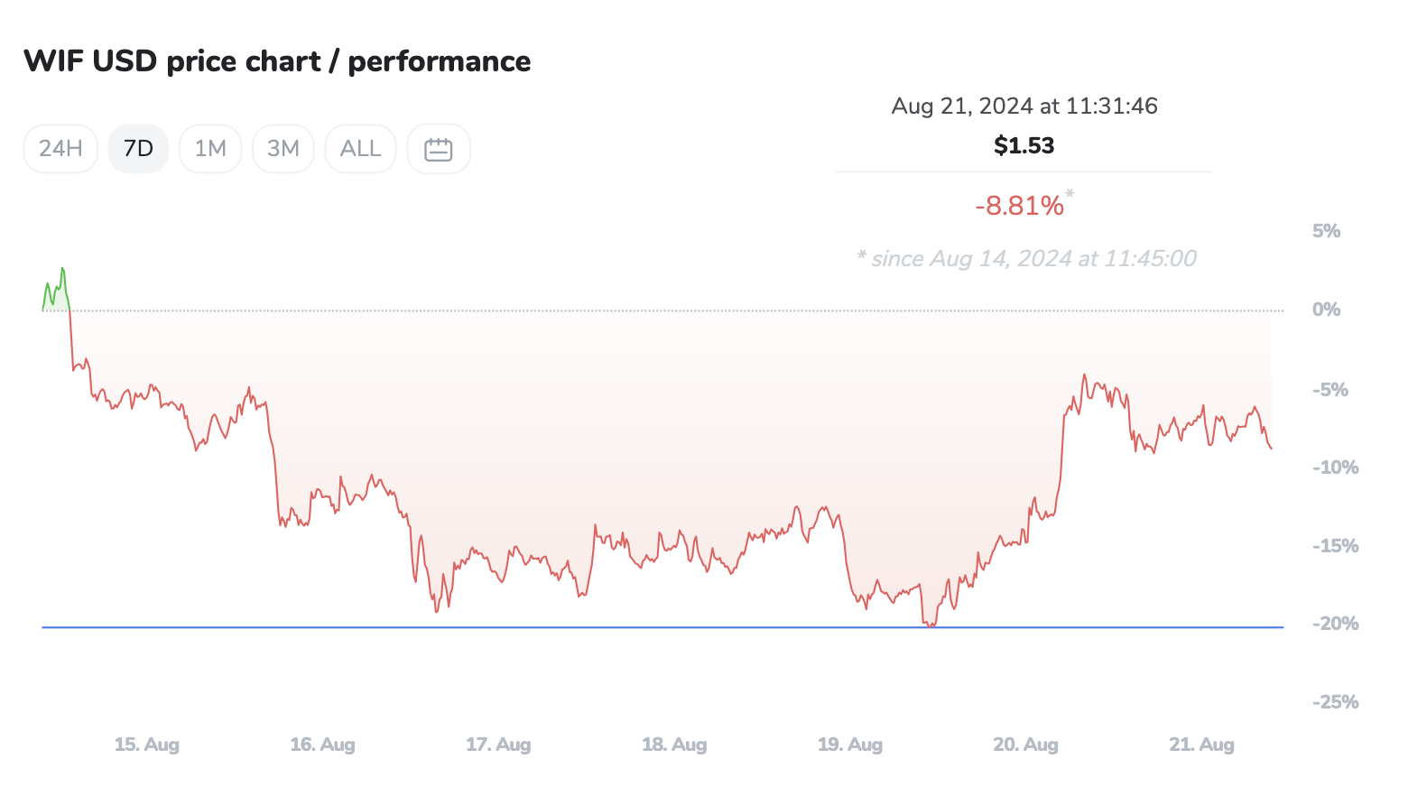 More recently, Dogwifhat’s price has been volatile, with the token experiencing a sharp decline from $3 to $1.56, leading to concerns among investors. The token’s price currently hovers around $1.50, a critical support level that traders are closely monitoring.