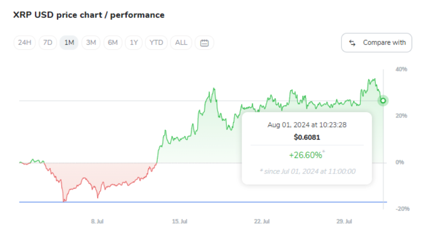 XRP has also seen significant price action, dropping nearly 5.4% to $0.606, yet not erasing gains made earlier. This decline follows a period of accumulation by "whales" or large holders of XRP, indicating potential future growth despite the recent setback. Ether and Solana have also experienced declines, dropping 3.3% and 2.27% respectively.