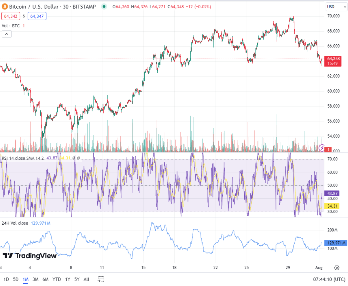 In conclusion, Bitcoin's technical outlook is mixed. The price is exhibiting a bearish trend influenced by macroeconomic factors and market sentiment. However, the oversold RSI and critical support levels offer a glimmer of hope for a potential rebound. Investors should closely monitor these levels and broader economic indicators, including the upcoming Federal Reserve meeting, to make informed trading decisions. Maintaining support above $63,200 is pivotal for a bullish scenario, while a drop below this level could indicate further bearish trends.