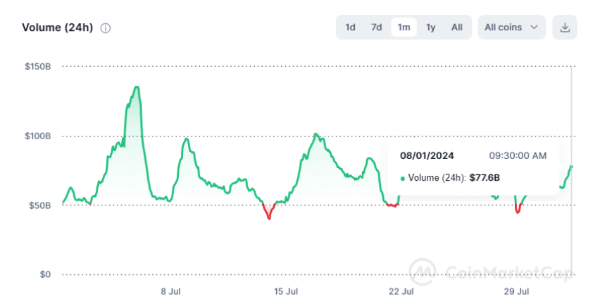 An upward trendline is providing support near $63,200. Maintaining this support level is crucial for sustaining any bullish momentum. If Bitcoin can stay above this trendline, it may see a buying trend driving the price back towards the $66,000 resistance level. Conversely, breaking below this trendline could reinforce the bearish scenario, leading to further declines.