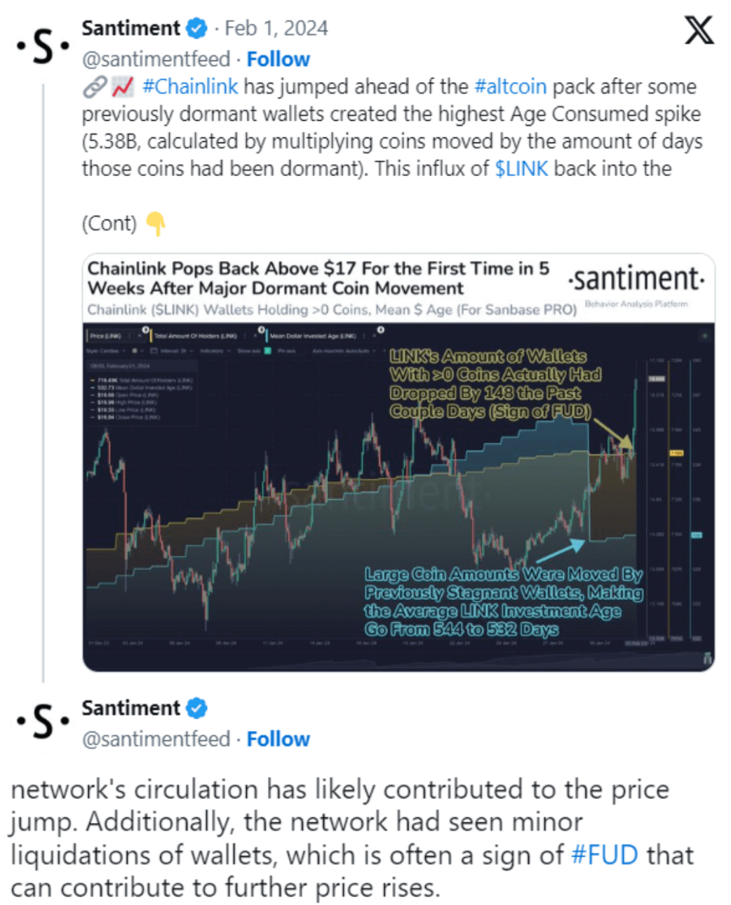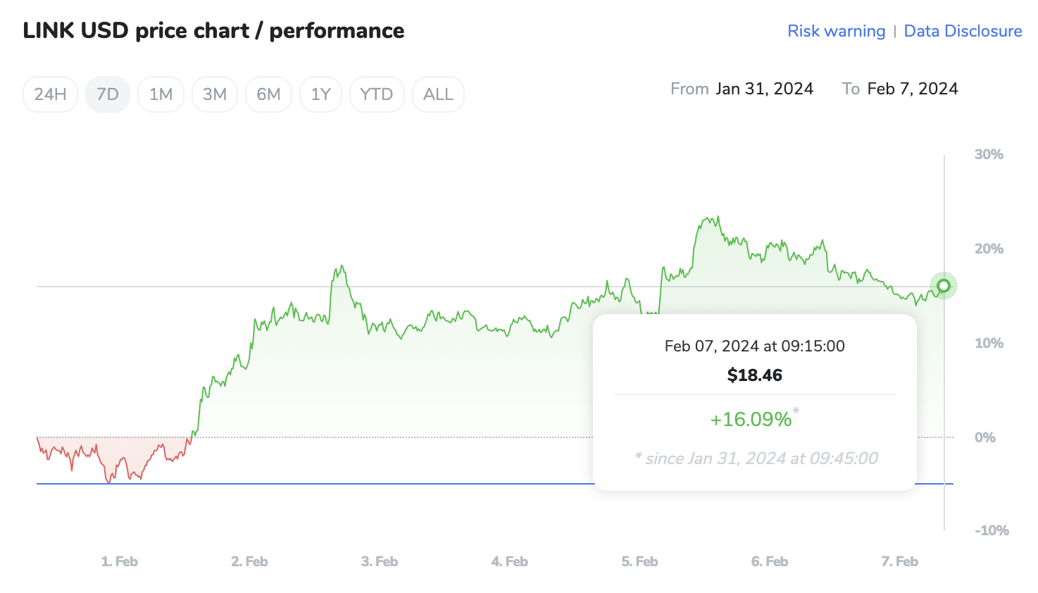 Chainlink's native token, LINK, experienced a notable surge of 16 % over the past 7 days, reaching a 22-month high. This surge comes amidst a relatively stable Bitcoin (BTC) trading around $43,000, while altcoins, including LINK, showed gains. The surge in LINK marks an end to a three-month period of consolidation, positioning it as one of the leading decentralised oracle networks in the cryptocurrency market. The surge in LINK's price reflects the growing demand for platforms that provide data, compute, and cross-chain capabilities, essential for traditional financial institutions to adopt blockchain technology and tokenized Real World Assets (RWAs) at scale.