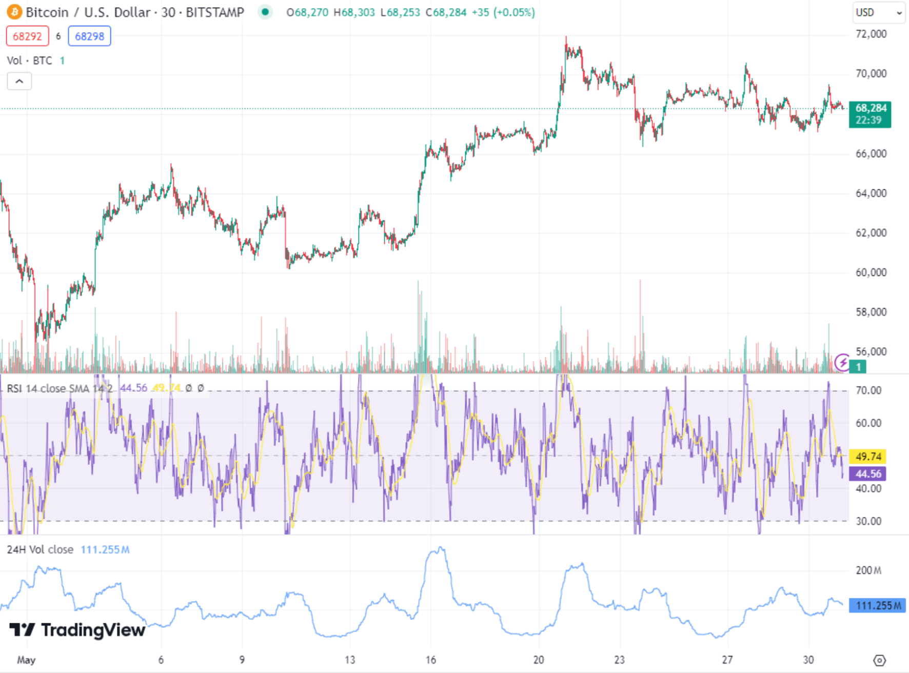 As of late May 2024, Bitcoin (BTC) is trading around $68,305, showing a slight increase of 0.71%. The market's sentiment remains bullish, with the 50-day Exponential Moving Average (EMA) at $68,211 indicating a positive trend as long as the price stays above this level. Immediate resistance levels are $68,880 and $69,770,, which are crucial for potential upward movements. On the downside, immediate support is found at $67,170, with further support at $66,590. The Relative Strength Index (RSI) is at 50, suggesting a neutral market sentiment.