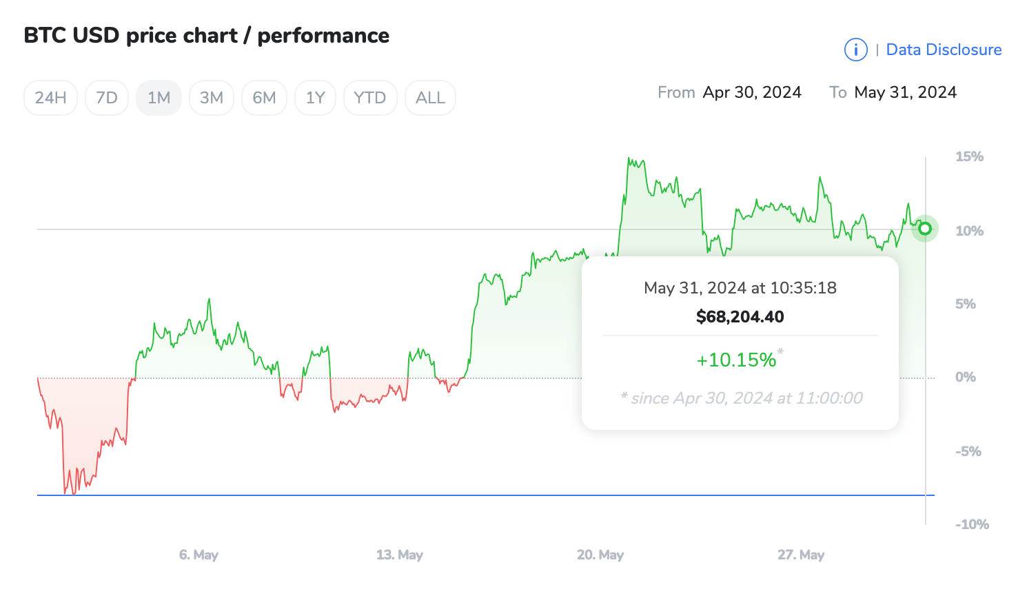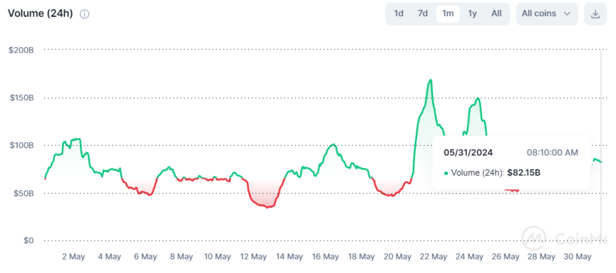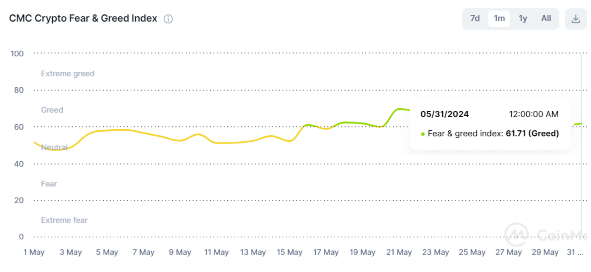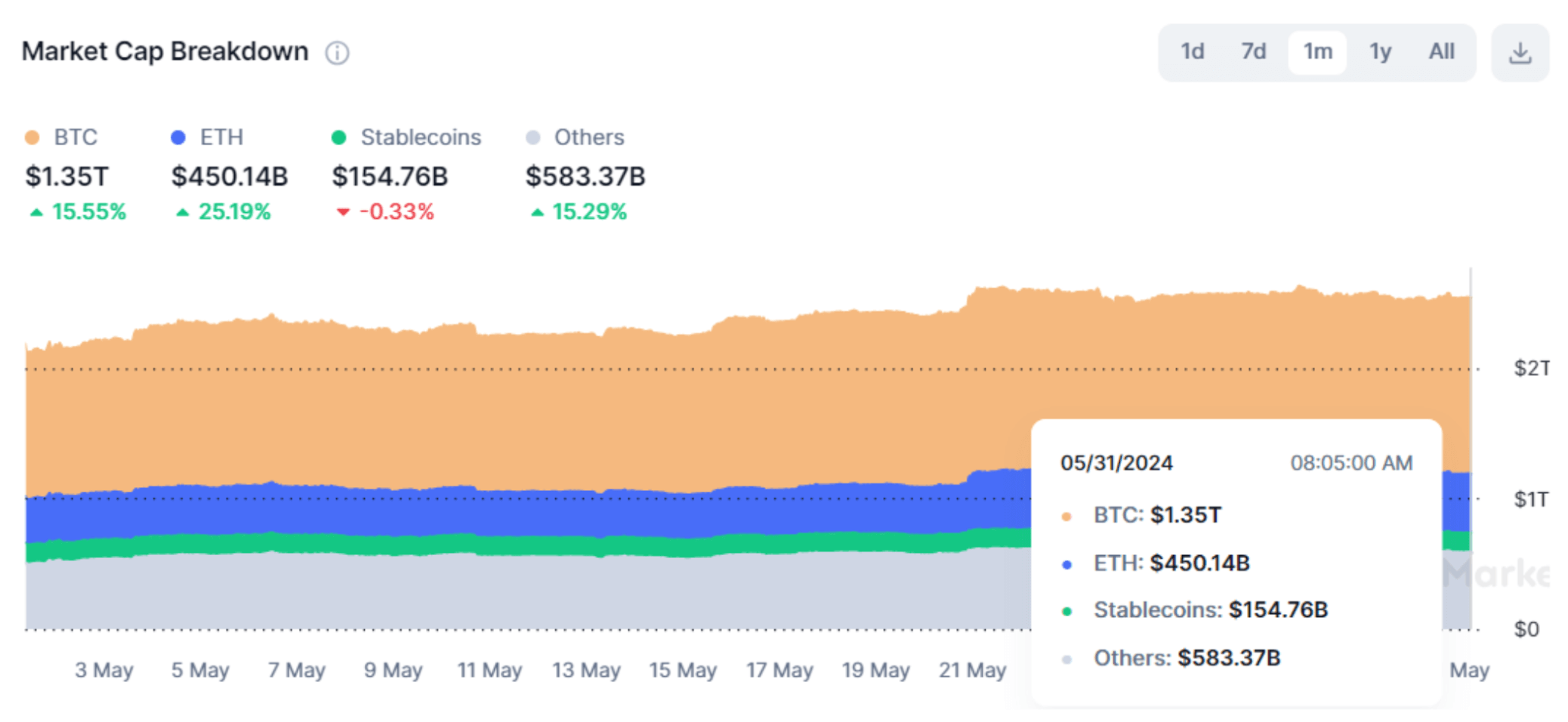 The cryptocurrency market on May 31, 2024, exhibited a mixed performance, reflecting its characteristic volatility. Bitcoin (BTC) stood out by topping the $68.5K mark, trading primarily in the green with a 0.71% increase over the past 24 hours. This surge pushed Bitcoin's price to $68,306, highlighting its resilience and dominance, which grew by 0.41% to 53.07%. The positive sentiment is also noticeable for Ethereum (ETH), whose price revolves around $3,800, experiencing a 0.80% decline in 24h to $3,759.93. This divergence underscores the different dynamics at play within the crypto market, where Bitcoin's growth is buoyed by increasing institutional interest and regulatory clarity, while Ethereum faces consolidation pressures despite the long-term optimism around Ethereum 2.0 and its technological advancements.