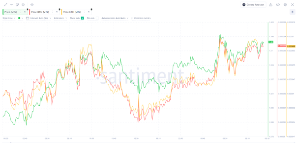 As for price levels, Metal DAO is currently trading near its five-day high of $1.38, marking a 18.15% increase in the last 7 days. However, it's essential to note that MTL is hovering near a key resistance level at $1.4, suggesting that it might face selling pressure in the near future. Furthermore, the coin's recent trading volume has been relatively low compared to its seven-day average, potentially indicating a degree of caution among traders.