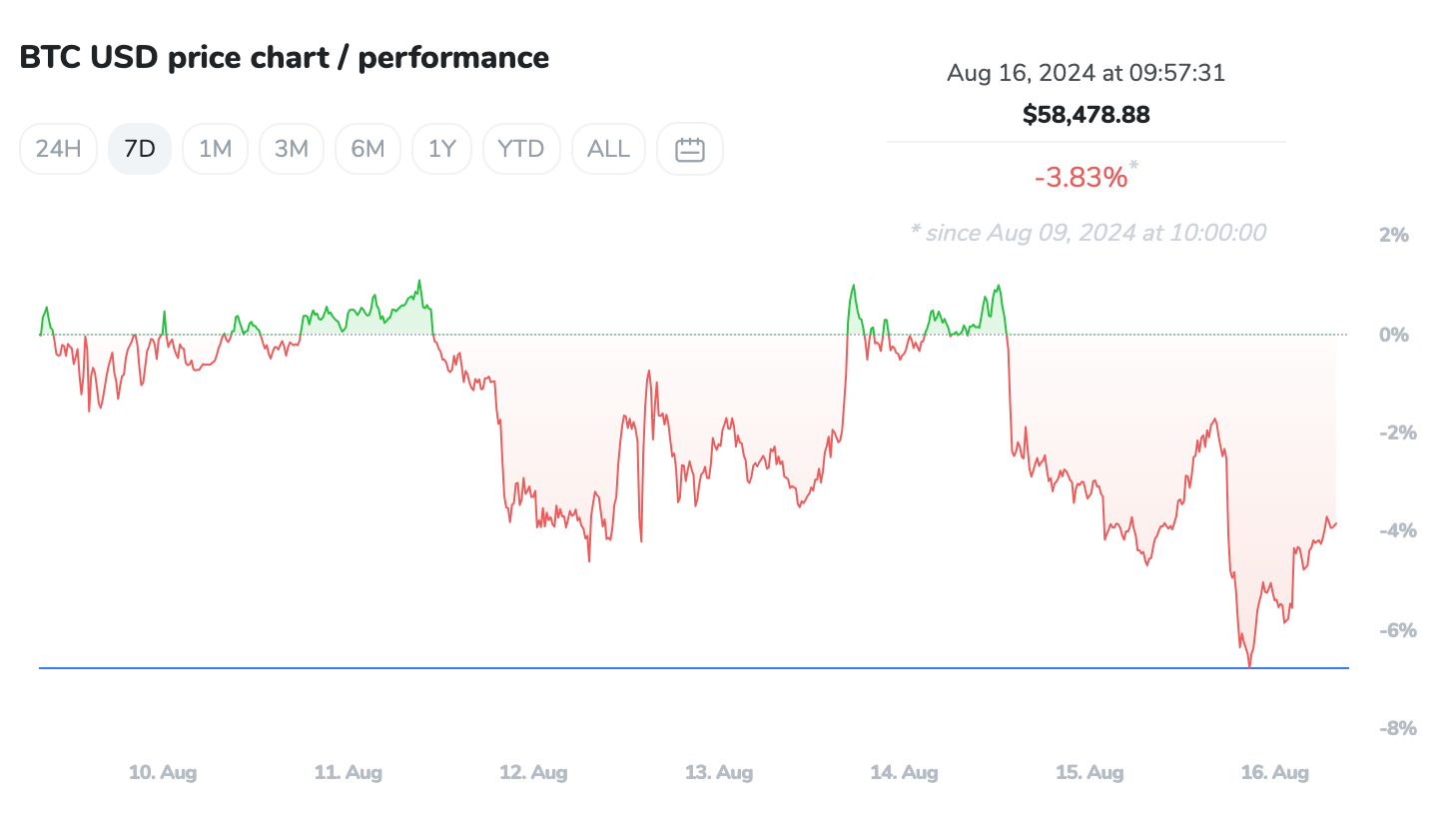 Bitcoin has had a turbulent week, marked by fluctuations that saw its price drop from nearly $63,000 to $57,000. The weekend was particularly sluggish for BTC, as it oscillated between $60,000 and $61,000. Monday brought another dip, though less severe, with Bitcoin falling just below $58,000. Despite briefly rebounding to nearly $62,000 after the U.S. released its Consumer Price Index (CPI) data for July, Bitcoin couldn't maintain its gains. Reports of the U.S. government sending $600 million to Coinbase Prime added to the downward pressure, pushing BTC to its local low of just under $58,000.