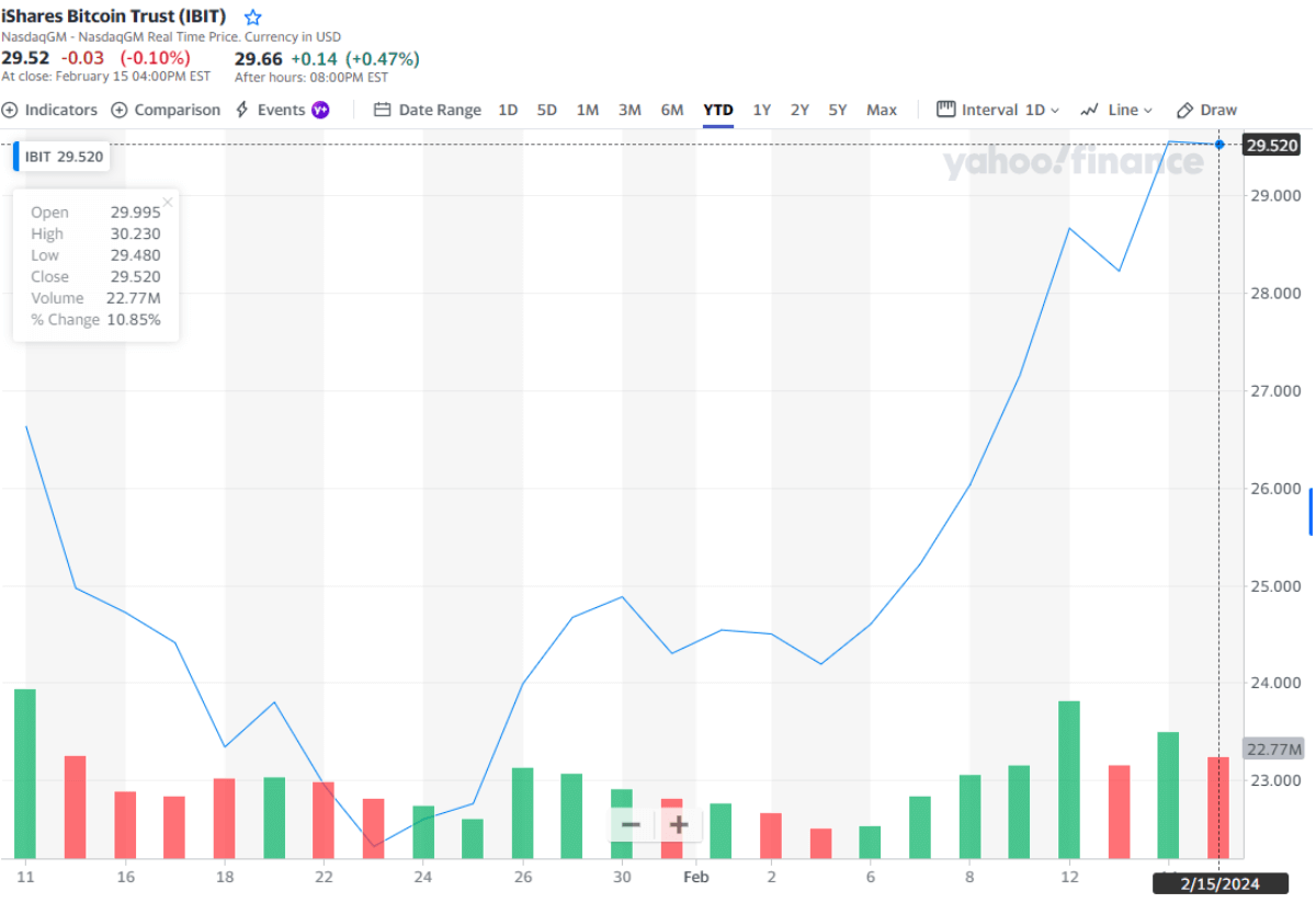 BlackRock's iShares Bitcoin Trust (IBIT) has made a significant impact in the ETF market just 17 days after its launch. With a staggering $3.2 billion in year-to-date inflows, IBIT has quickly climbed to become one of the top five ETFs of 2024, according to Bloomberg Intelligence data. This achievement places IBIT in the league of mammoth index ETFs like iShares Core S&P 500 ETF (IVV) and Vanguard 500 Index Fund ETF (VOO), highlighting the growing interest in Bitcoin among investors.
