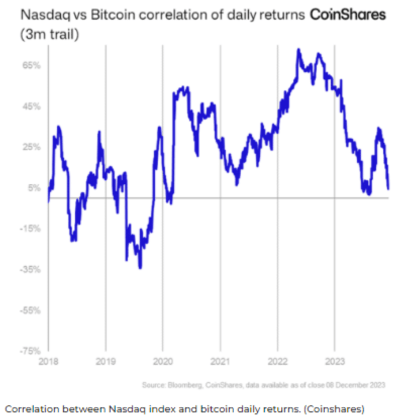 James Butterfill, head of research at Coinshares, attributes this trend to the growing correlation between bonds and equities, emphasising bitcoin's role in providing optimal diversification and risk-adjusted returns among alternative assets. Moreover, bitcoin has matured as an asset, evidenced by its decreased correlation with the Nasdaq index, dropping below 5%. This marks a departure from the previous bull cycle, highlighting bitcoin's resilience and potential for continued outperformance in the face of evolving market dynamics and the Federal Reserve's anticipated softer stance in 2024.