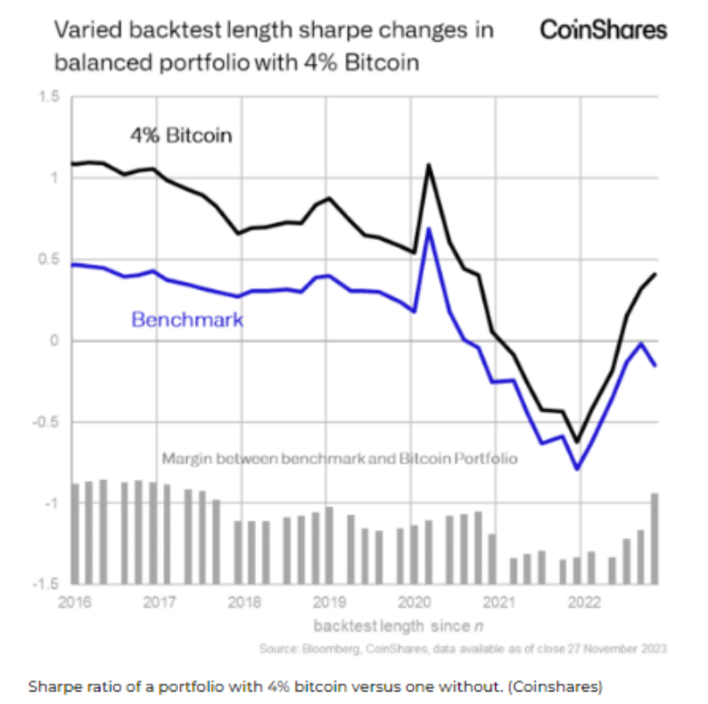 Coinshares, a digital asset investment firm, has observed a significant widening in the Sharpe ratio gap between portfolios containing 4% bitcoin and those without. This implies that portfolios incorporating bitcoin have exhibited superior risk-adjusted returns, solidifying the cryptocurrency's status as an alternative asset.