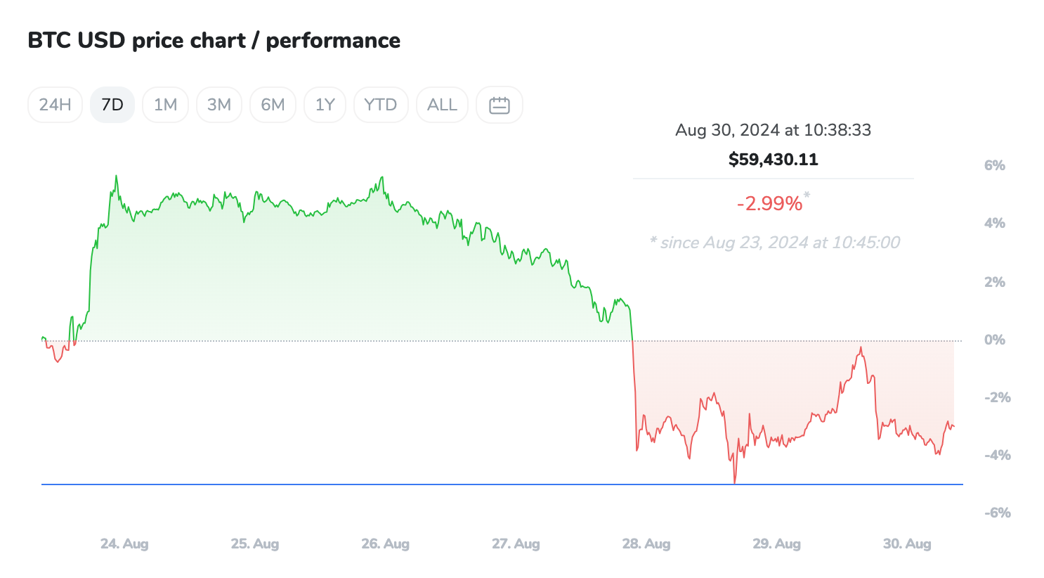 Bitcoin is nearing the end of a challenging week, having dropped 2%. Despite this, buyers have shown resilience, especially around the key support level at $58,000. The price fell between Monday and Tuesday, forming a bearish wedge, but buyers stepped in to stop further decline. It is crucial for Bitcoin to hold above the $58,000 support level over the weekend to prevent sellers from taking full control and pushing the price down to the low $55,000s, similar to early August.