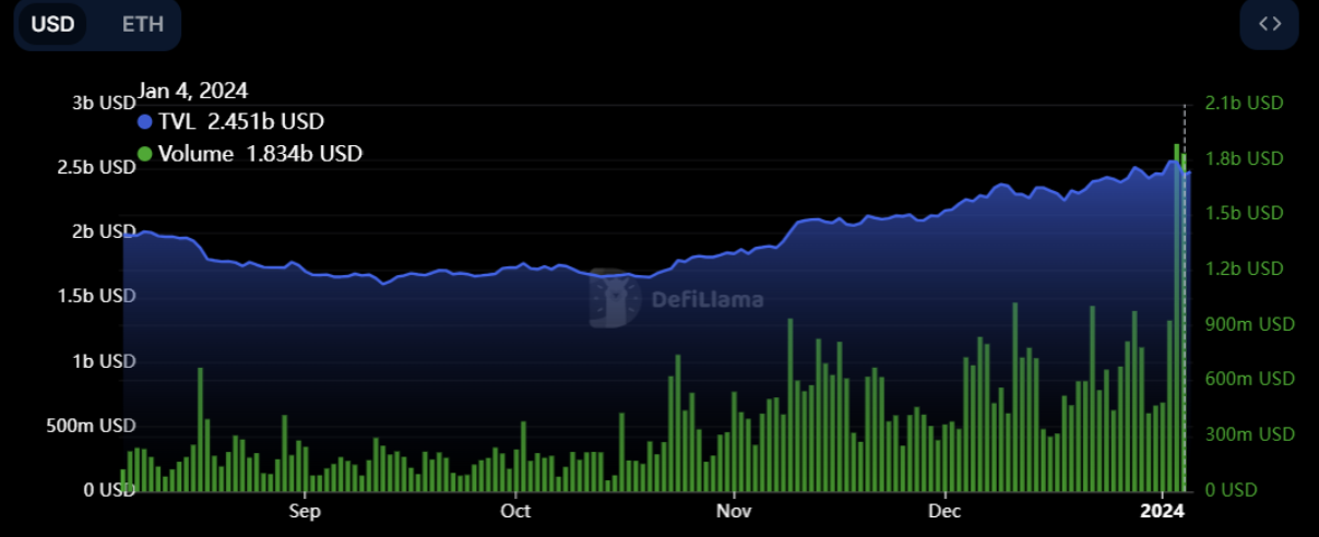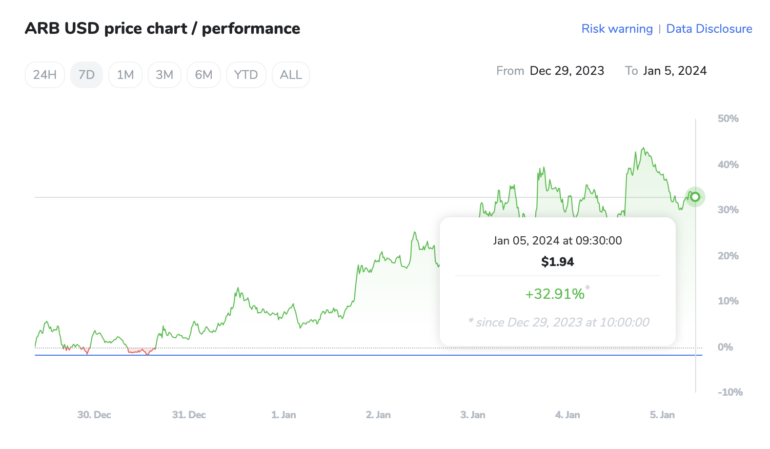 Arbitrum's ARB token has set a record high, nearing $2, while the total value locked (TVL) on the Arbitrum network surpasses $2.5 billion. This surge, coupled with increased on-chain volumes, indicates a growing interest in the Arbitrum ecosystem. Notably, decentralised exchanges like GMX and Gains Network have seen heightened activity due to token incentives, contributing to positive sentiment for ARB tokens. Data shows a substantial increase in TVL on Arbitrum-based applications since October, signalling a trend of net inflows.