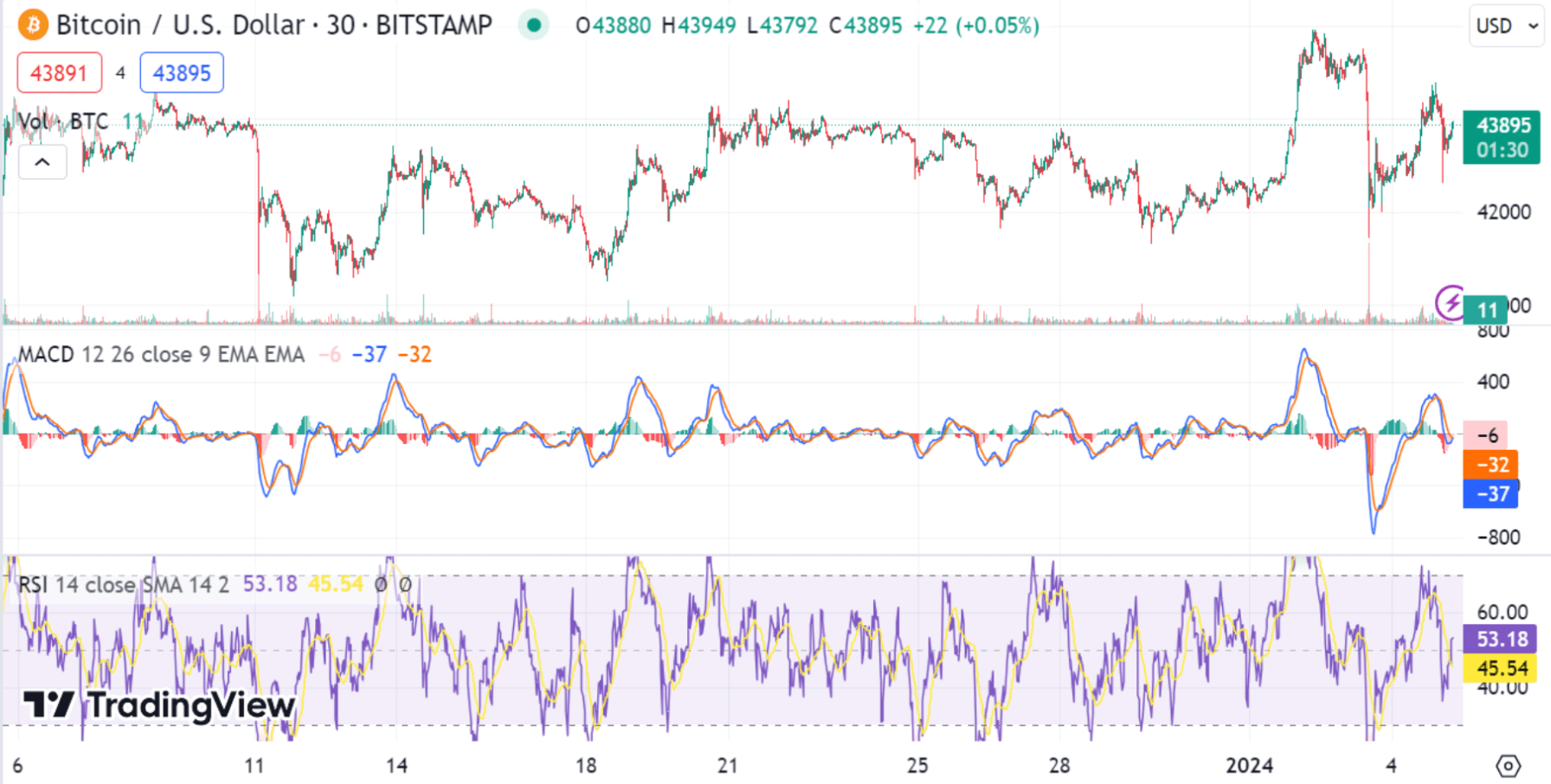As Bitcoin commemorates its 15th anniversary, the cryptocurrency faces a complex and challenging market terrain, marked by a notable 6,7% price fluctuation. The recent fluctuations in the price range, oscillating between $41,636 and $45,822, have raised concerns among investors and traders. With a market capitalization of $832 billion and a trading volume of approximately $35.96 billion in the past days, Bitcoin is undergoing a critical phase that demands a meticulous technical analysis.