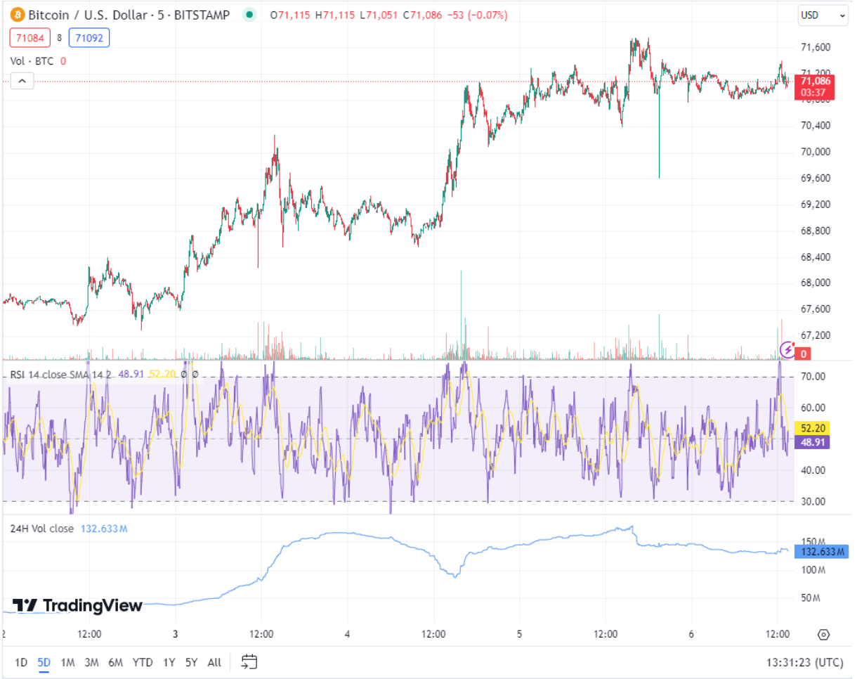 Bitcoin (BTC) is currently trading at approximately $71,090, experiencing a slight dip of about 1% from its recent highs. The pivot point for Bitcoin is set at $70,600, acting as a critical level in today’s trading dynamics. If Bitcoin maintains its position above this pivot point, it is likely to encounter resistance at $71,800, followed by $72,500. Conversely, a drop below $70,600 could see support levels at $69,650.