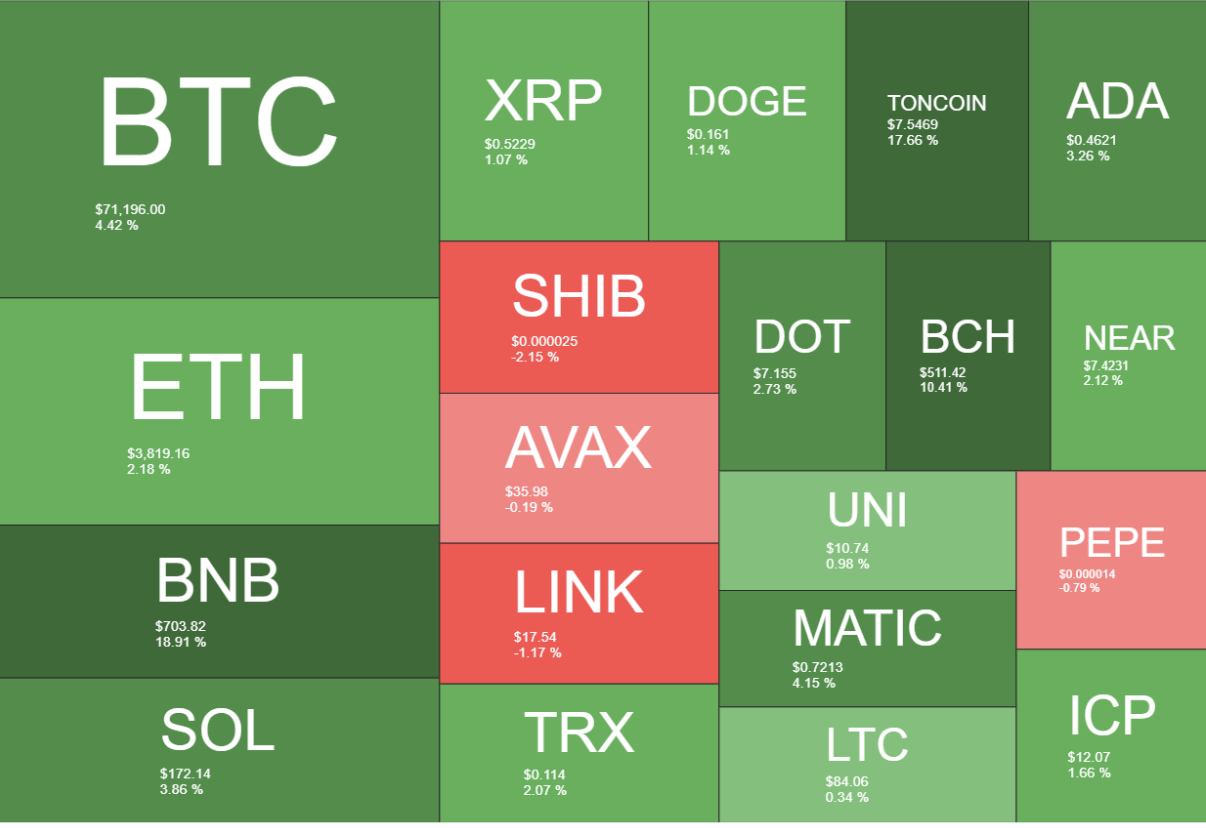 U.S.-listed spot bitcoin ETFs experienced a significant influx of over $880 million on a single day, led by Fidelity’s FBTC, which saw $378 million in inflows. This surge in investment activity pushed Bitcoin’s price to over $71,000 in Asian trading hours, marking a 3% increase in 24 hours. The CoinDesk 20 index, which tracks the largest tokens, also rose by 2.65%. This heightened activity comes after a period of low inflows and is attributed to a generally bullish sentiment in the market. The ETFs have attracted $3.3 billion in the past four weeks, reflecting increasing investor confidence and a favourable outlook for cryptocurrencies.