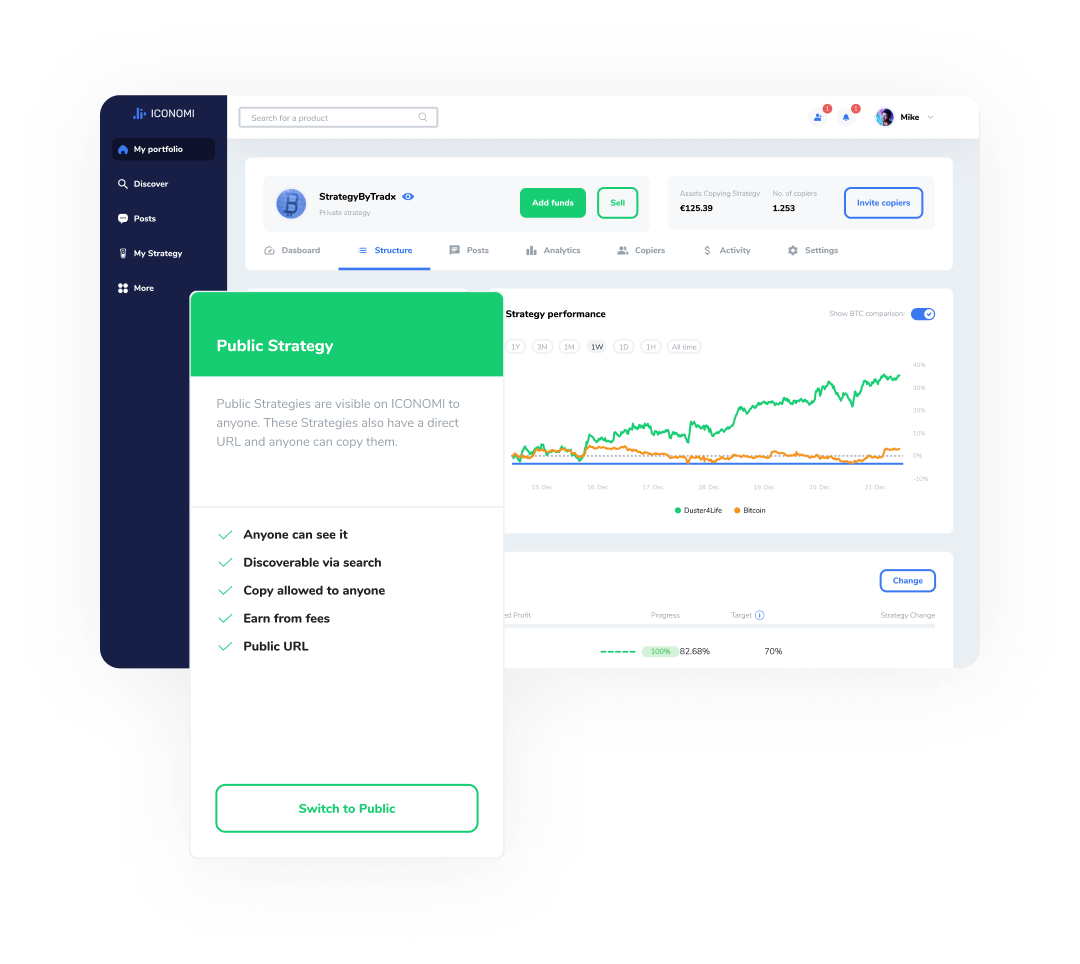 Alle på ICONOMI vil se navnet ditt på plattformen og vil kunne kopiere Strategien du kjører. Du kan kommunisere direkte med dem, opprette kampanjegavekort og arrangementer og benytte deg av våre kanaler til markedsføring.