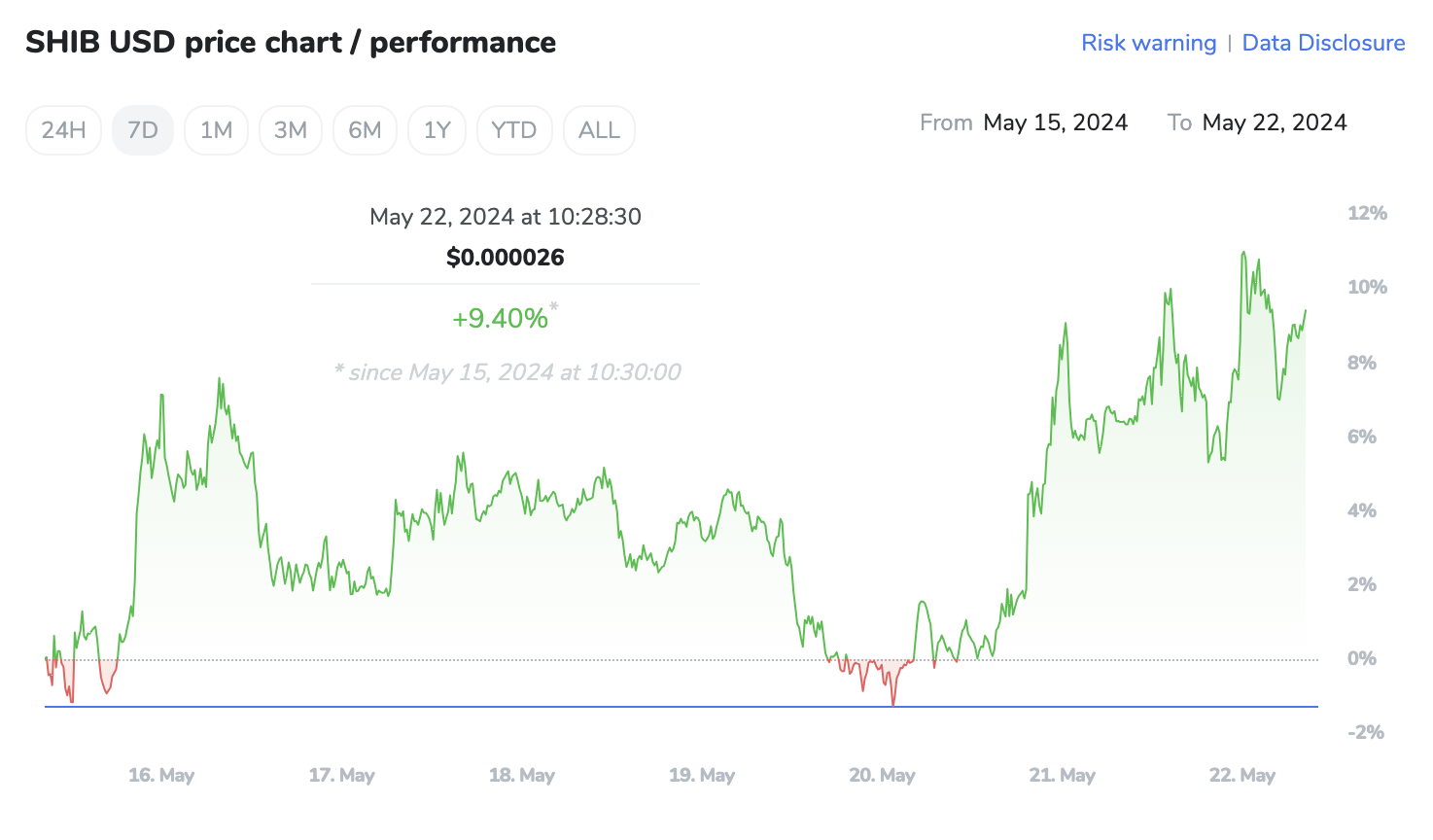 De prijs van Shiba Inu (SHIB) is de afgelopen 24 uur met 2,74% gestegen en bereikte $0,000026. Deze stijging komt overeen met een bredere positieve trend in de cryptocurrency-markt. De afgelopen week is SHIB met 9,30% gestegen, waarmee een eerdere maandelijkse daling van 3,93% is omgekeerd. Dit recente opwaartse momentum benadrukt de groeiende interesse in meme coins onder investeerders. Opmerkelijk is dat SHIB een aanzienlijk jaarlijks rendement van 202,94% heeft opgeleverd, waarmee het belangrijke cryptocurrencies zoals Bitcoin (BTC), Ethereum (ETH) en Solana (SOL) heeft overtroffen.