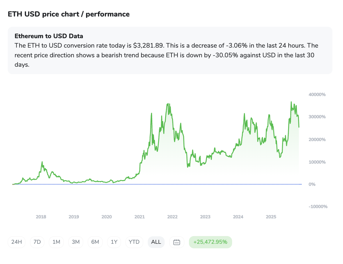 Ethereum (ETH) trenutno trguje pri 3.280,71 USD (–3,16 % v zadnjih 24 urah) in sledi podobnemu scenariju s pritiskom navzdol. Kriptovaluta je ponovno testirala dolgoročno linijo naraščanja, ki zdaj deluje kot ključna podpora med 3.166 in 3.300 USD. On-chain podatki kažejo, da nekateri vlagatelji zmanjšujejo izpostavljenost – bodisi iz previdnosti bodisi zaradi strateškega preoblikovanja portfelja. Odpornost pa ostaja visoko, pri območju 3.800–3.900 USD.