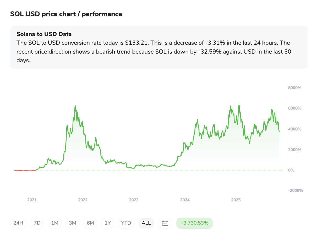 Solana (SOL) trguje pri 154,54 USD (–2,84 % v zadnjih 24 urah) in kaže mešano tehnično sliko. Giblje se znotraj t. i. »padajočega klina« – formacije, ki pogosto napoveduje bikovski preobrat. A njen nedavni padec pod ključno podporo med 170 in 180 USD kaže, da prodajni pritisk še ni popustil. Izpadi s kriptoborz so dodatno obremenili ponudbo, trenutna podpora je okoli 146–157 USD, odpor pa pri 168–174 USD.