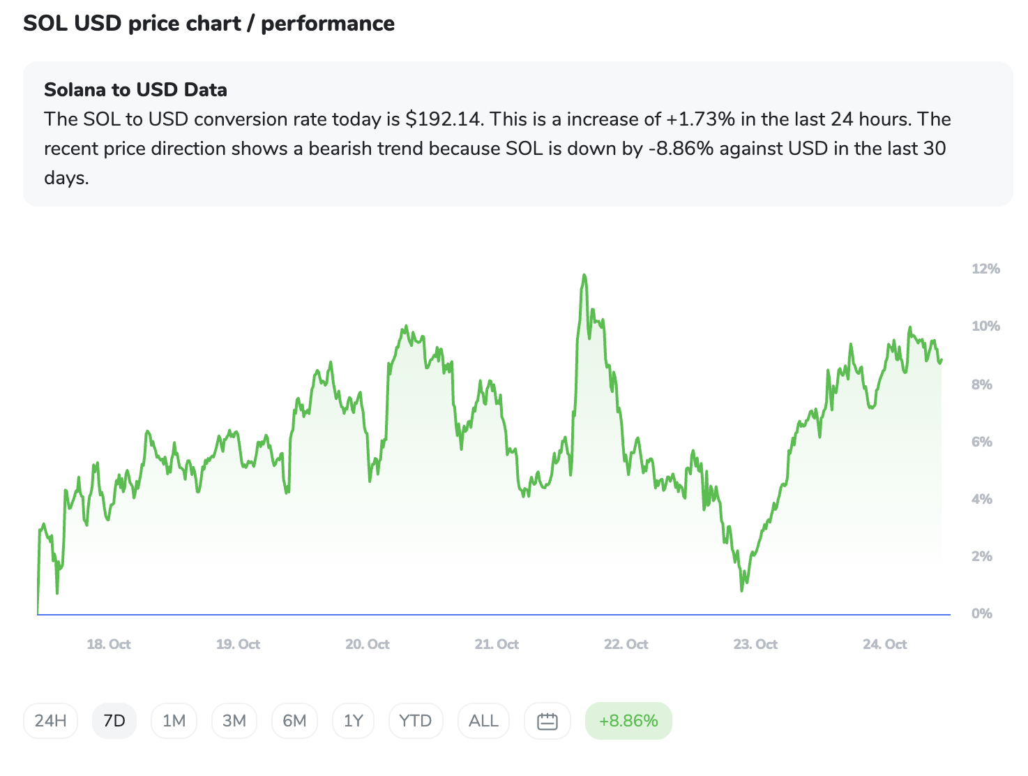 Solana, pri 191,84 $, sledi širšemu razpoloženju – v fazi korekcije in konsolidacije. Giblje se znotraj simetričnega trikotnika, kjer se razpon cen vse bolj oži – to običajno pomeni, da se nabira napetost pred večjim gibom. Podatki iz izvedenih trgov kažejo zmanjšanje špekulativnih pozicij in prevlado prodajalcev, kar potrjuje kratkoročno ranljivost. Ključna podpora je pri 170 $; če pade, bi lahko sledil globlji zdrs.
